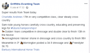 It looked like a mammoth weekend for Sam Griffiths and his young team at the Barbury International Horse Trials. Weetabix would be the fuel of choice as 6 of the yard would be performing. The competition gave the chance to both educate the young team and practice in the field. The Head Girl Charlotte Andrews got in on the action as well. You can see from the Facebook post below how they all thought the event went!